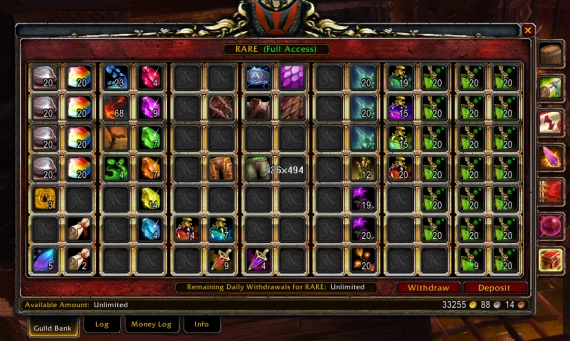 Two tabs (Rare) are restricted to Officers only, containing rarer and more expensive items. This is due to an unfortunate incident when a departing guild member looted high value items. If you wish to obtain any item in this tab, ask an Officer.
